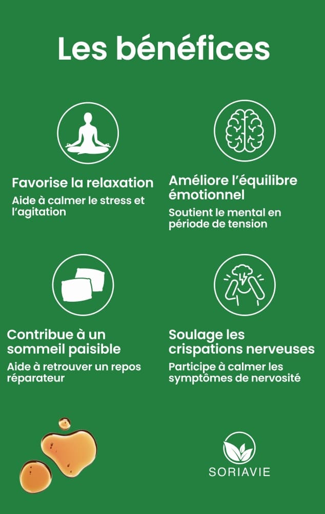 - Aide à retrouver la sérénité en cas de stress passager ou de nervosité.
